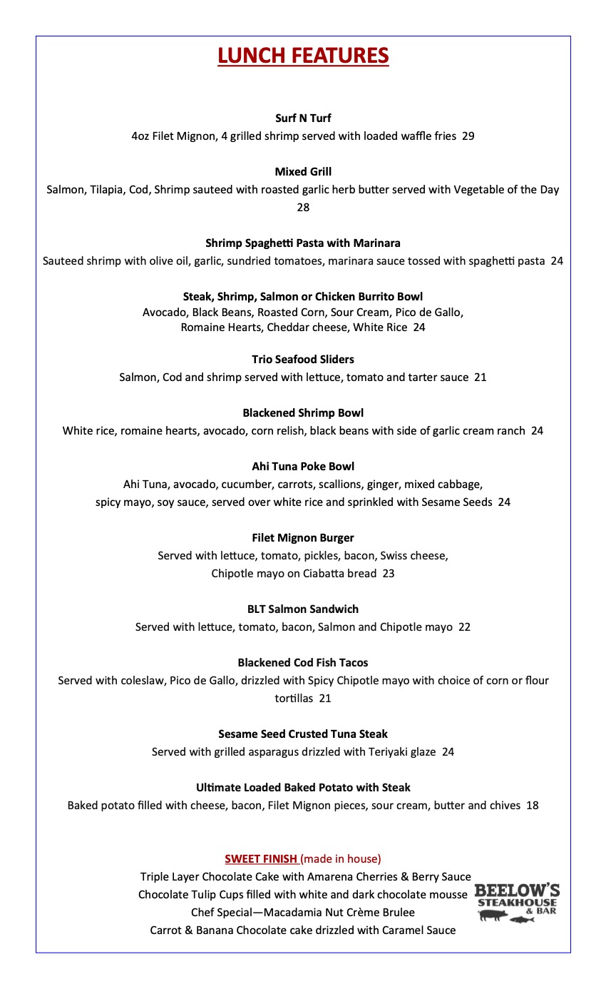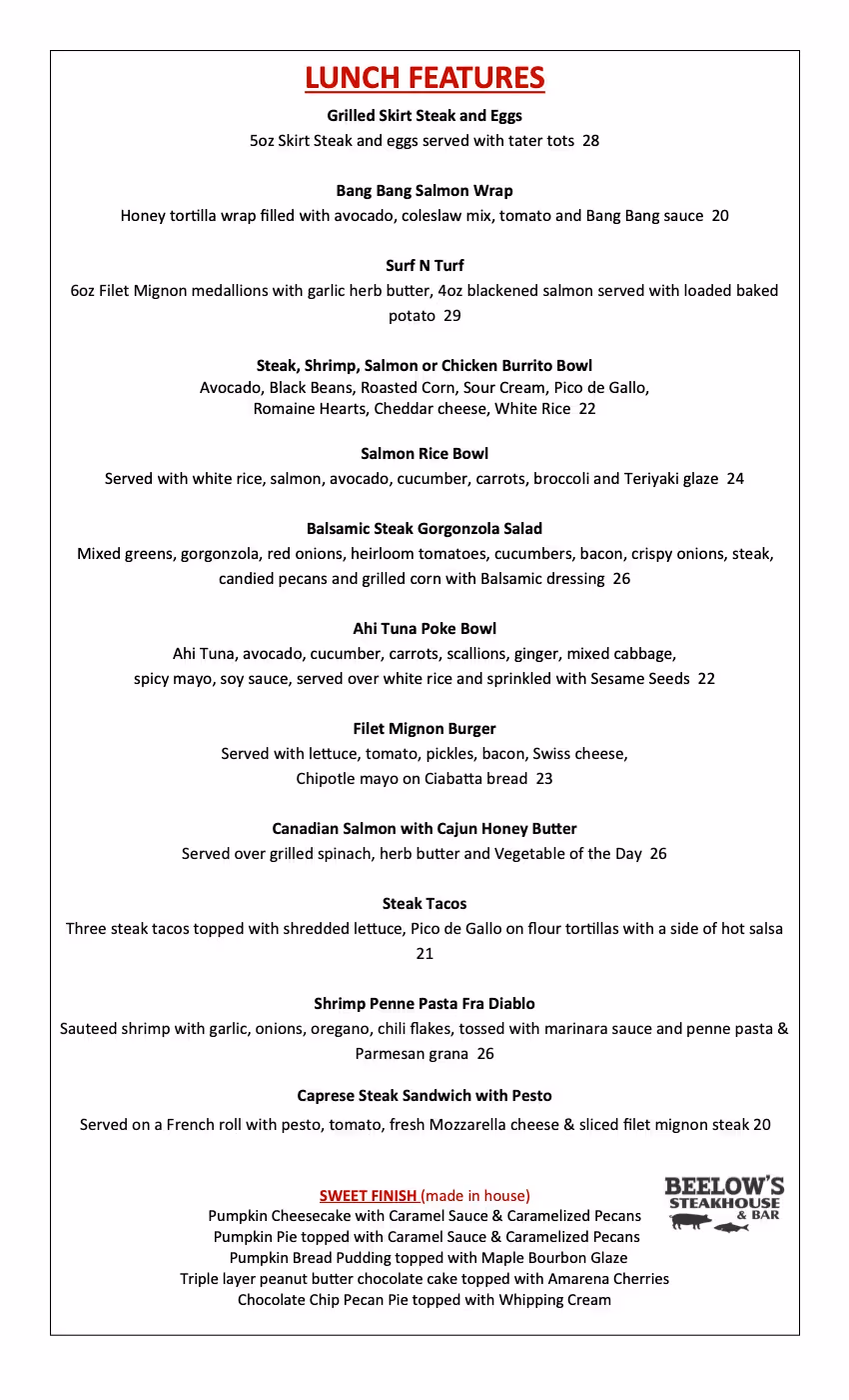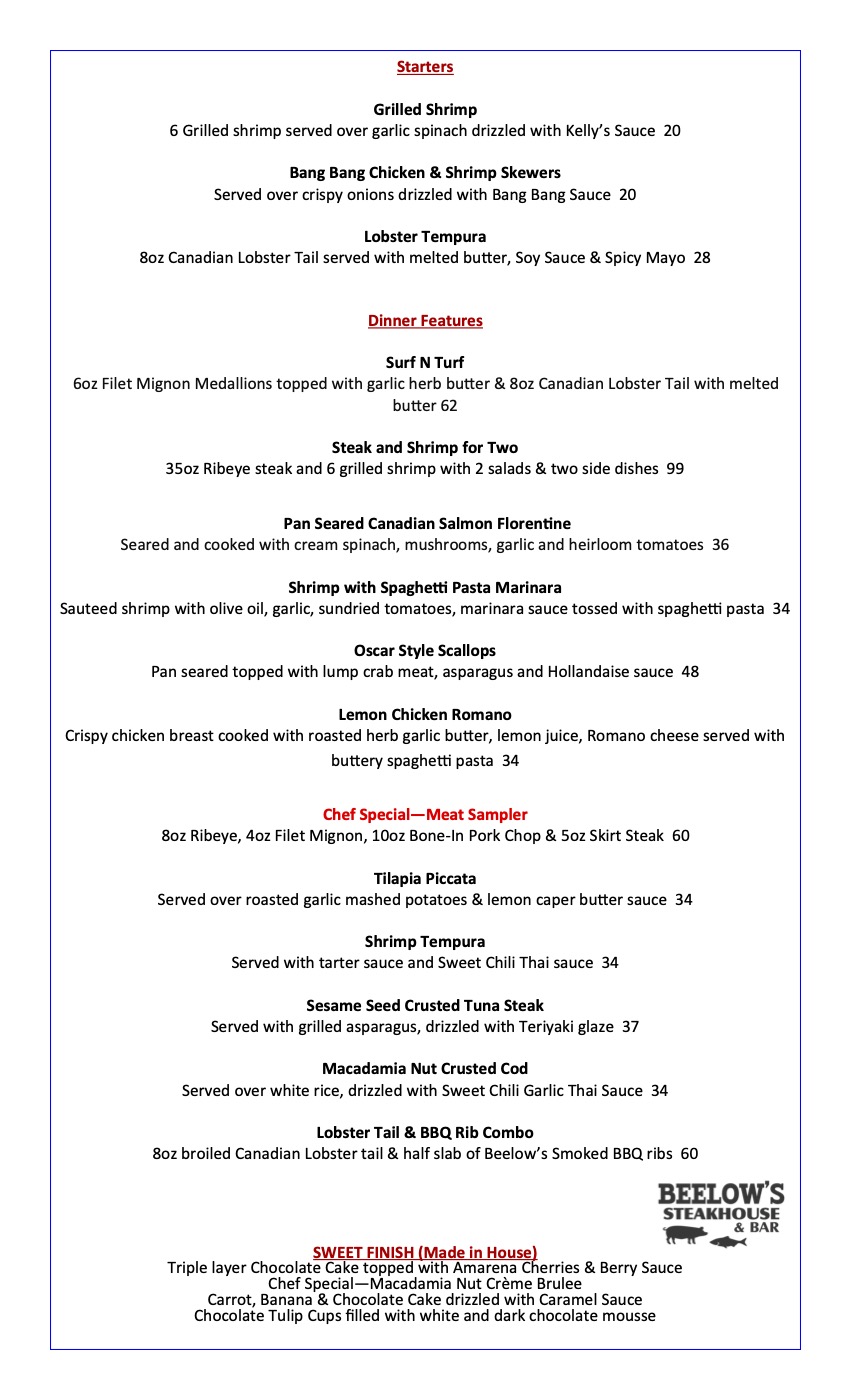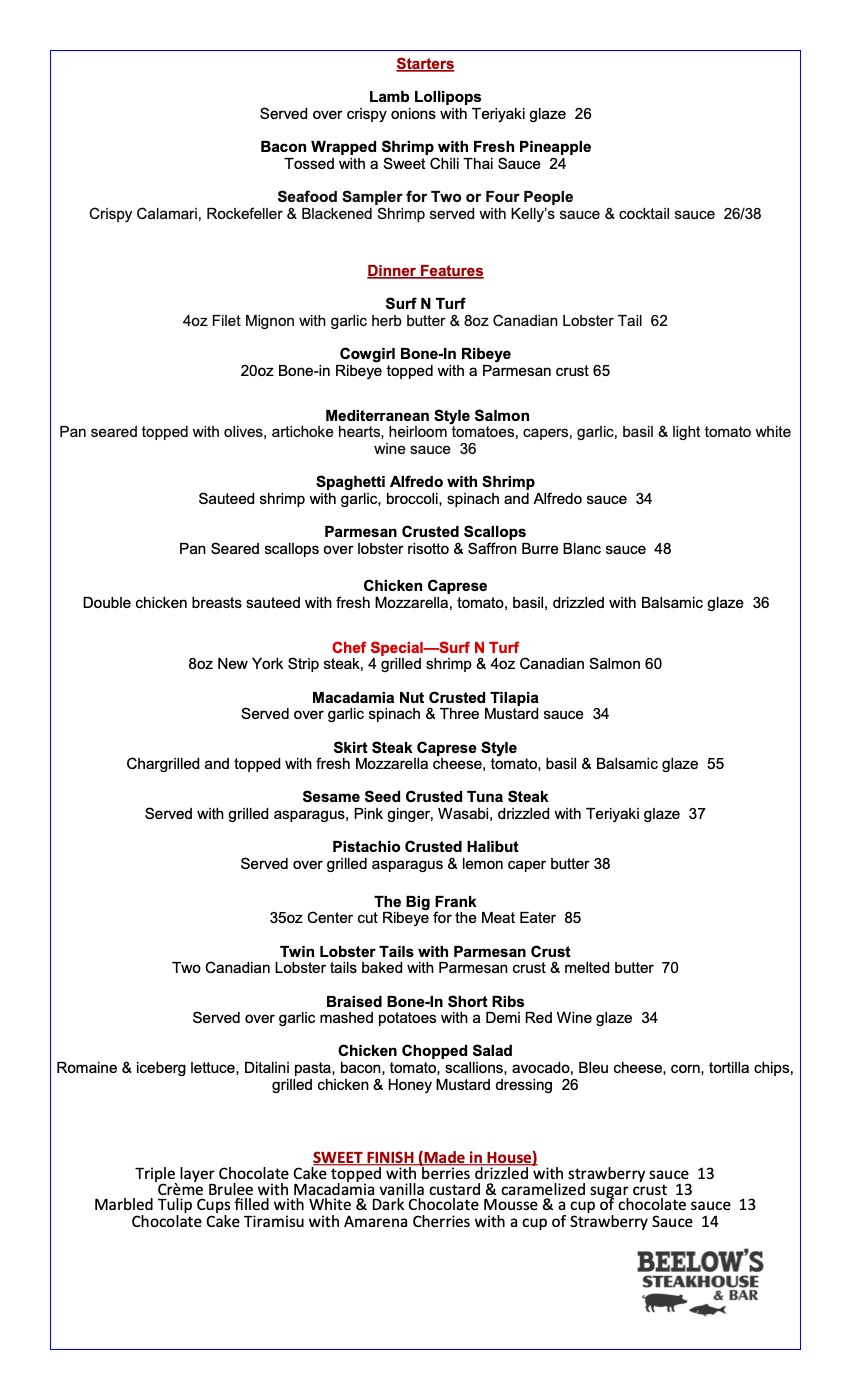 Beelow's Steakhouse strives to use locally sourced ingredients whenever possible, ensuring exceptional quality and flavor in every dish.