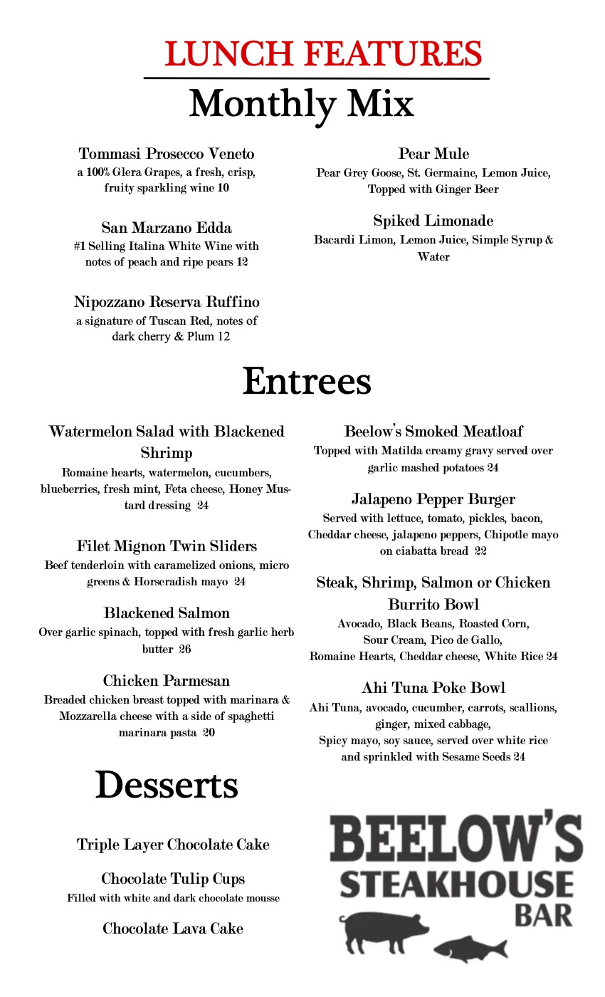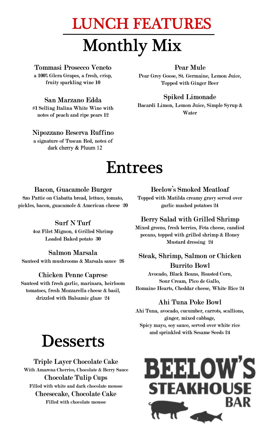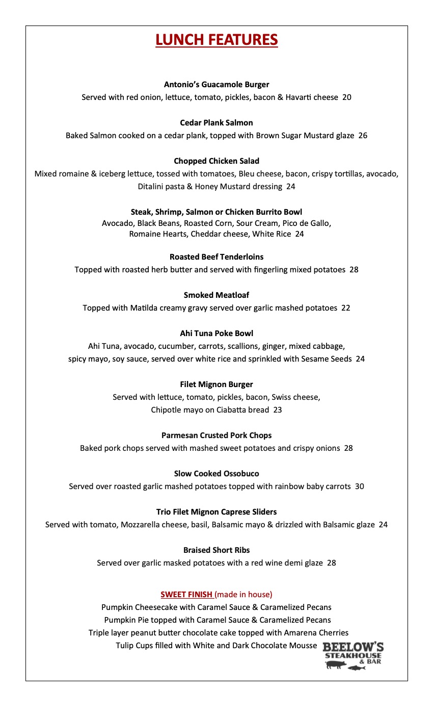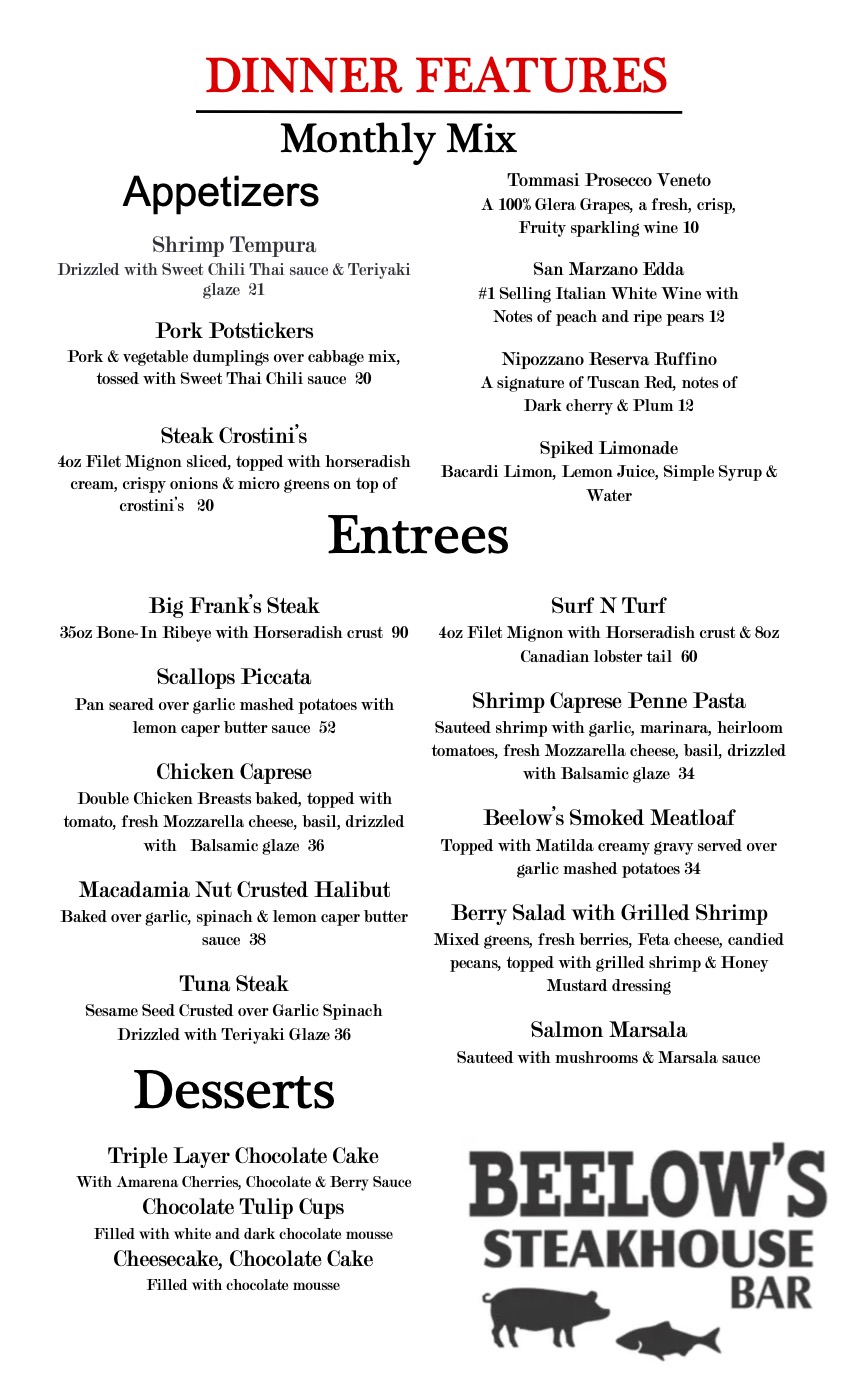 Beelow's Steakhouse strives to use locally sourced ingredients whenever possible, ensuring exceptional quality and flavor in every dish.